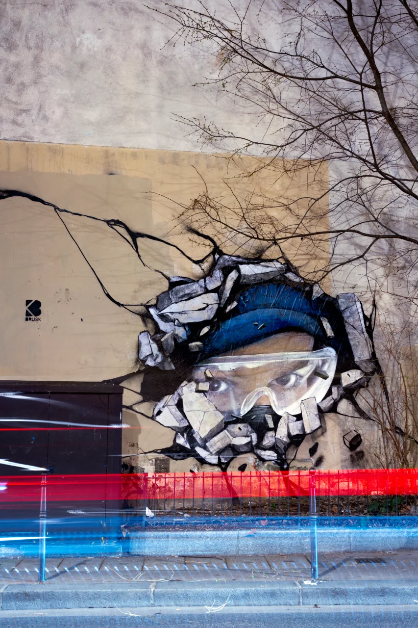 On a rien avec nous, tels des gamins qui se barrent d’un foyer, et pour rien. S’amuser autrement, avec ce qu’on a. On ne veut plus regarder des murs propres : on veut regarder à travers l’ordre de l’existant, et donner à voir notre regard sur lui. Bref, jouer. On ne suit pas le lapin blanc avec Alice : mais ce ne sont plus les passants qui regardent des murs, ce sont des murs propres — et appropriés — qui s’effritent pour laisser le vandale Donkishot regarder les passants. Mise en abîme.